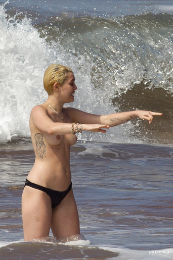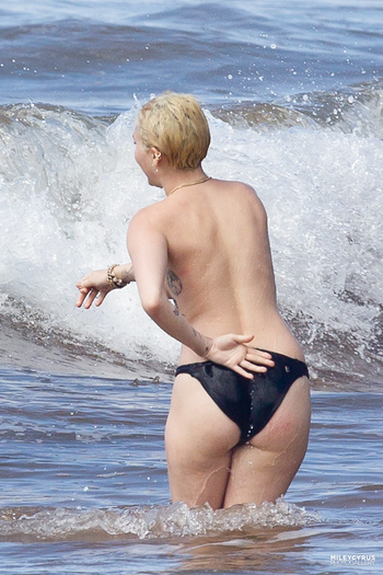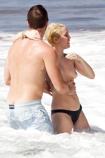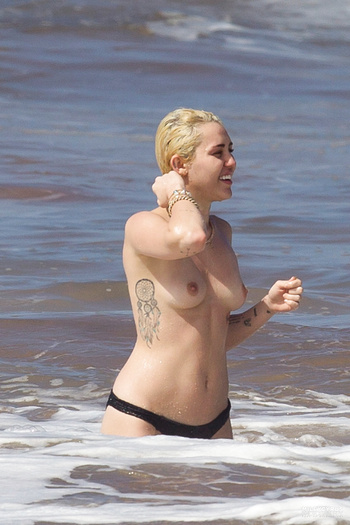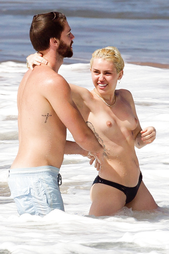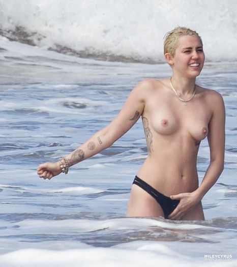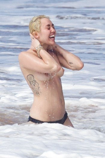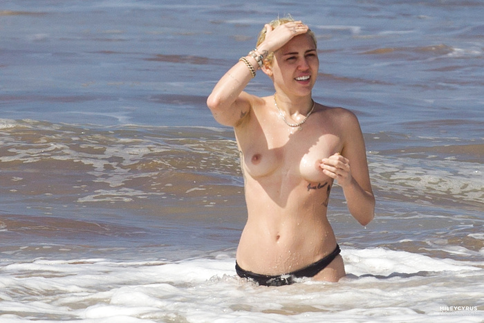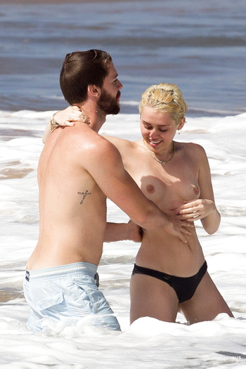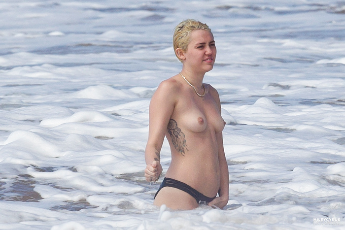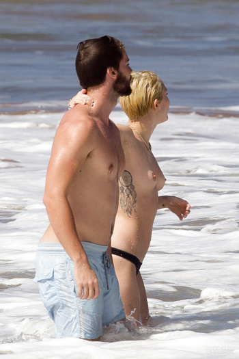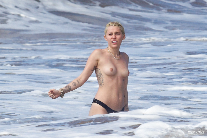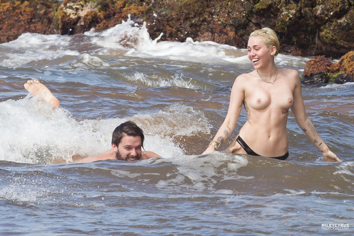 Miley Cyrus (22 years) caught topless on the beach in Hawaii with her boyfriend Patrick Schwarzenegger (January 2015).