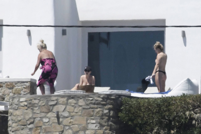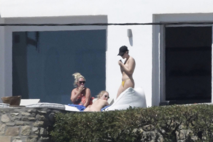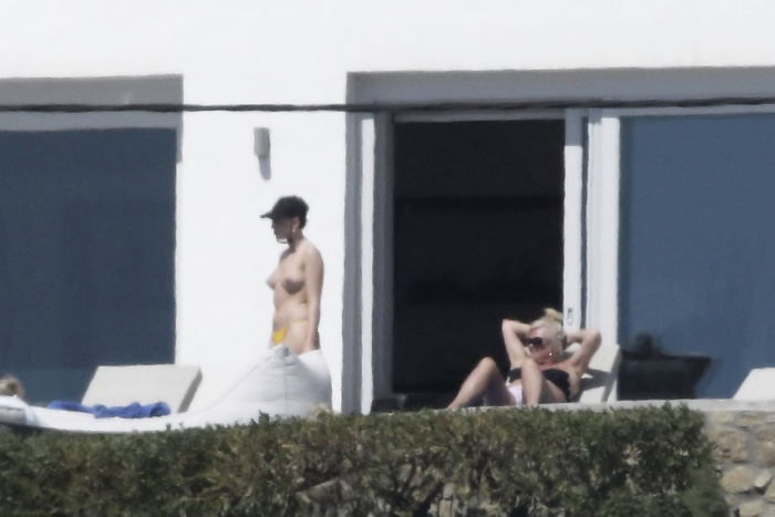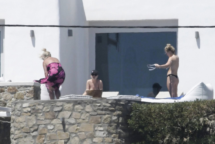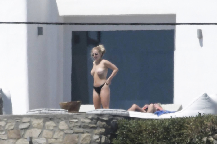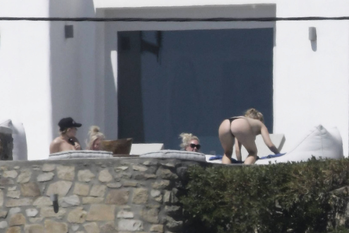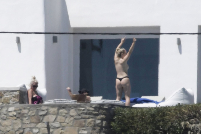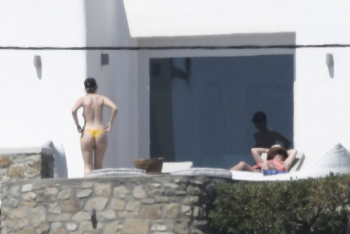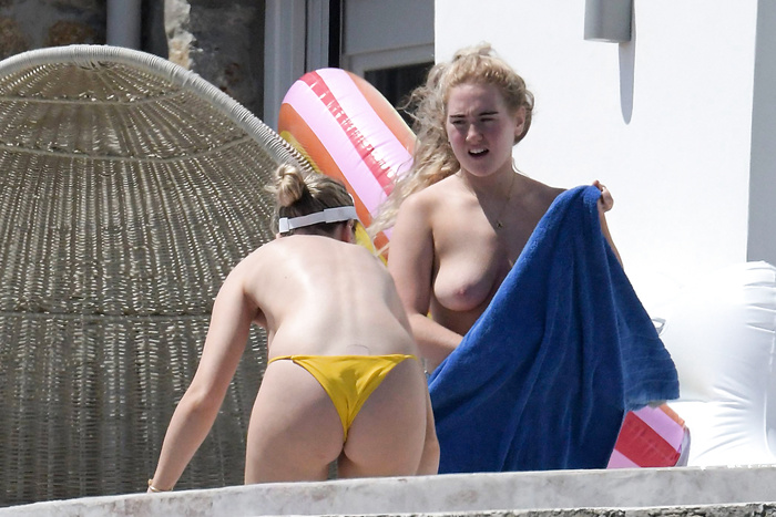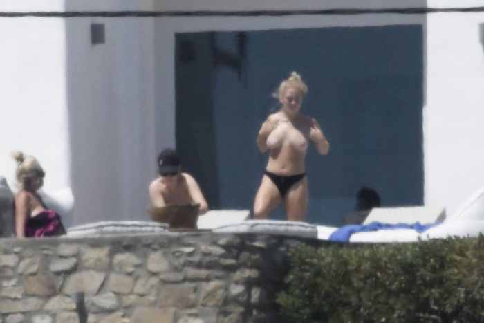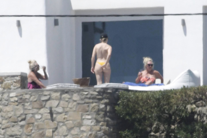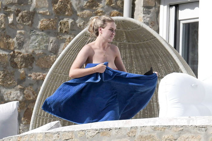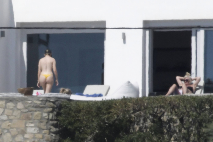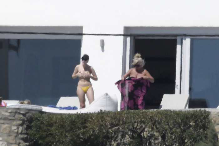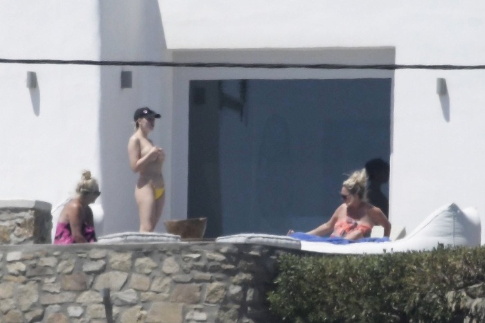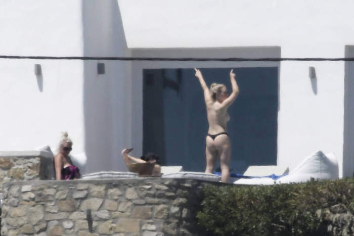 Singer Perrie Edwards (27 years) was caught topless sunbathing candids on vacation in Mykonos (Greece) with friends (June 2018).