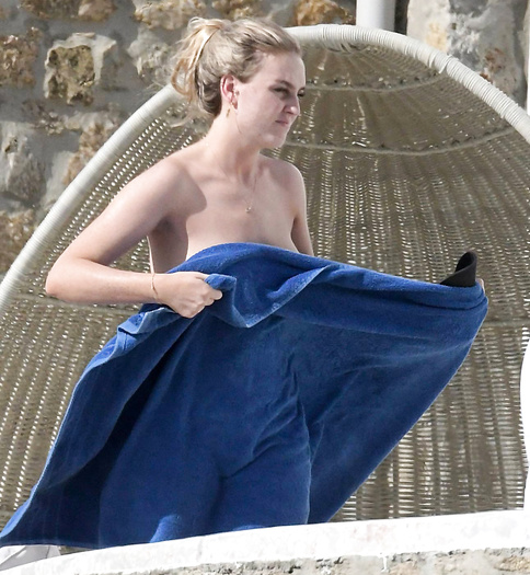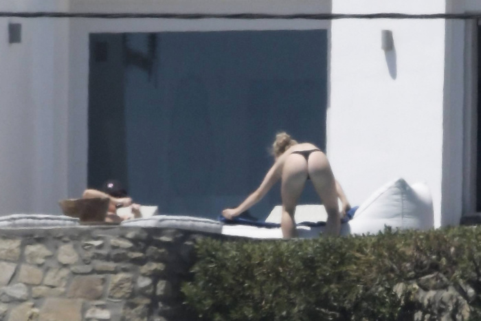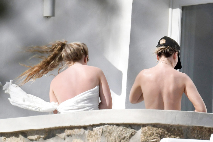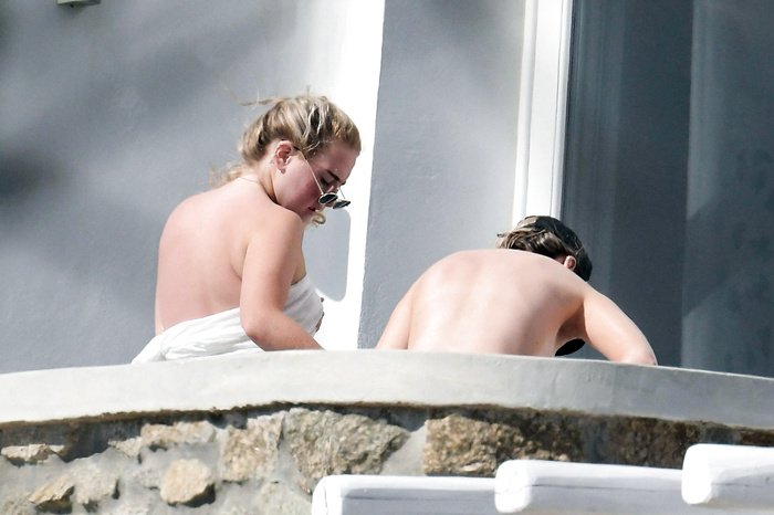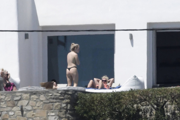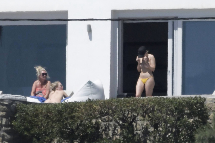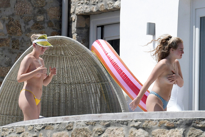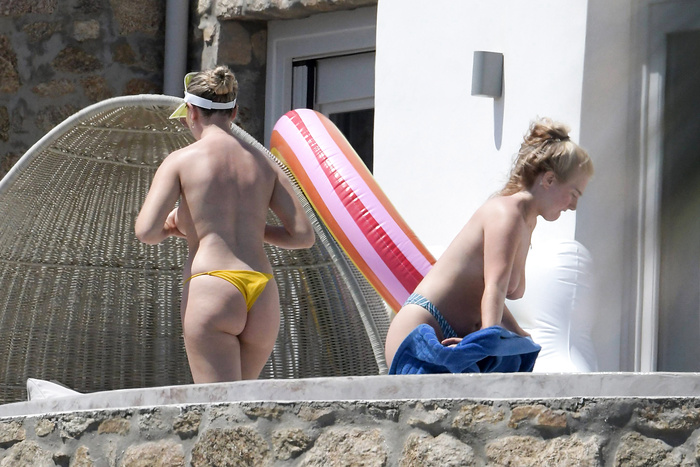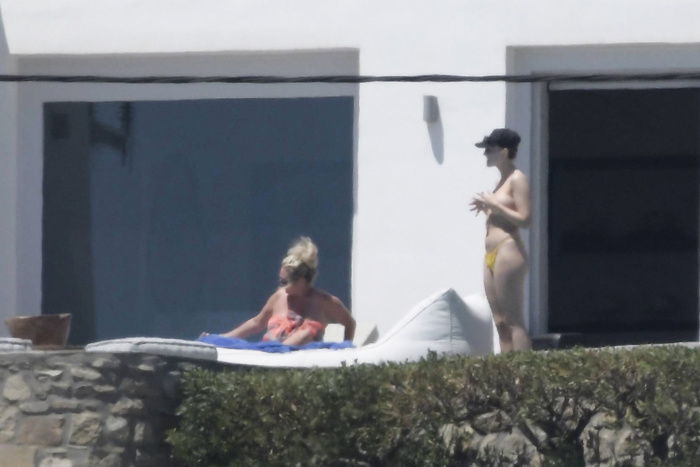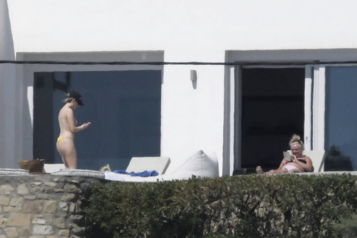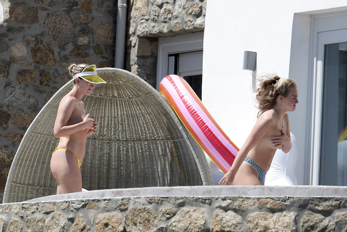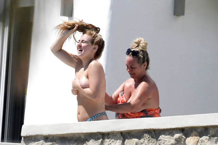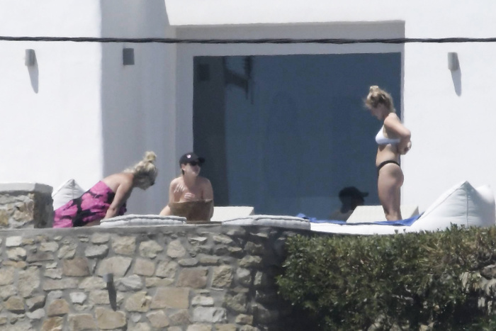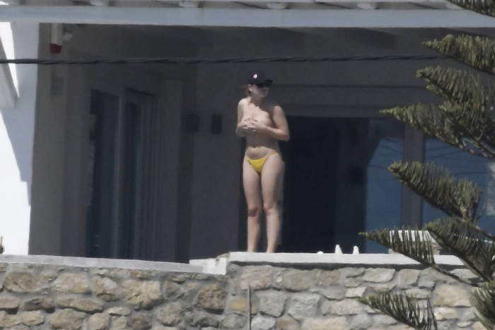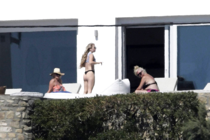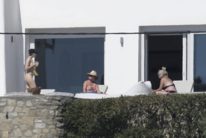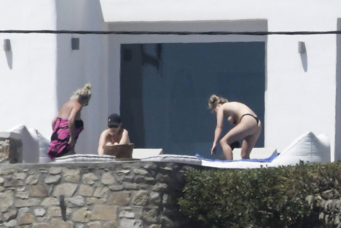 Singer Perrie Edwards (27 years) was caught topless sunbathing candids on vacation in Mykonos (Greece) with friends (June 2018).
