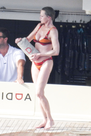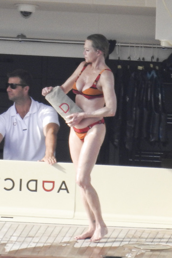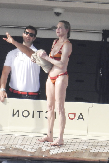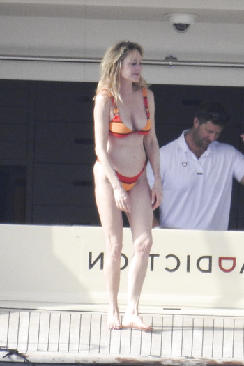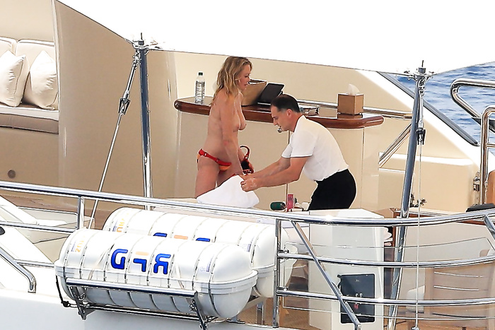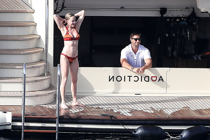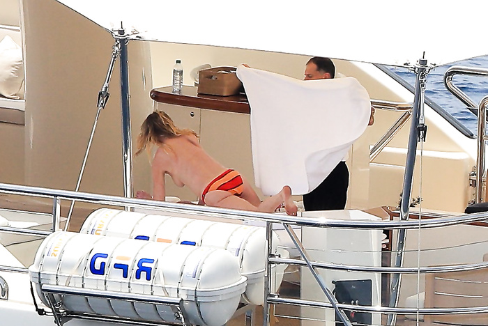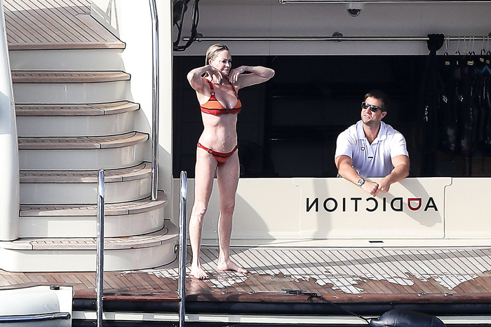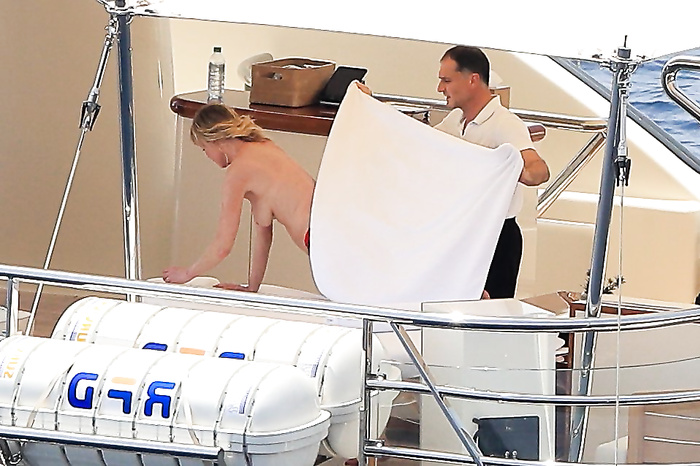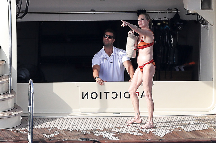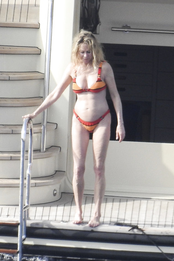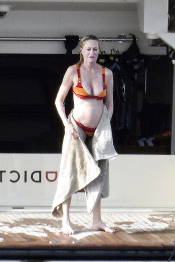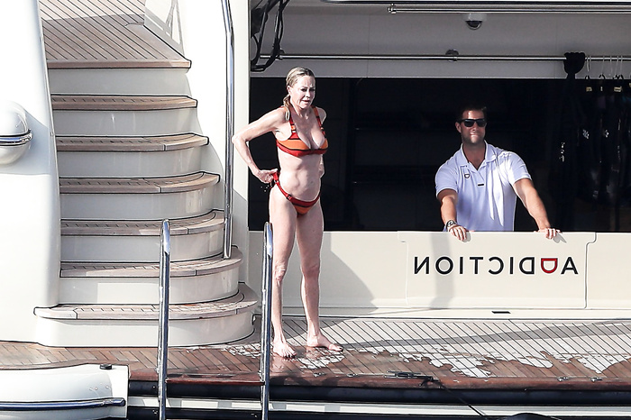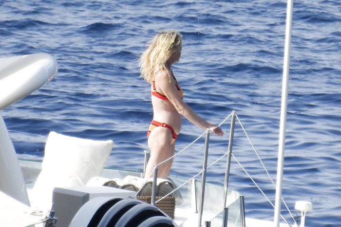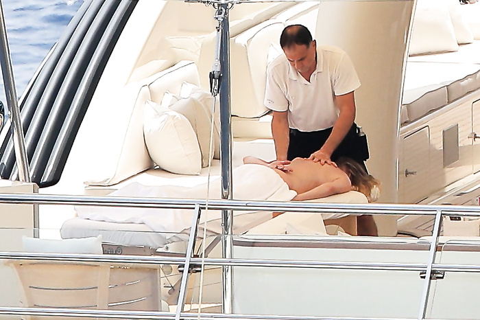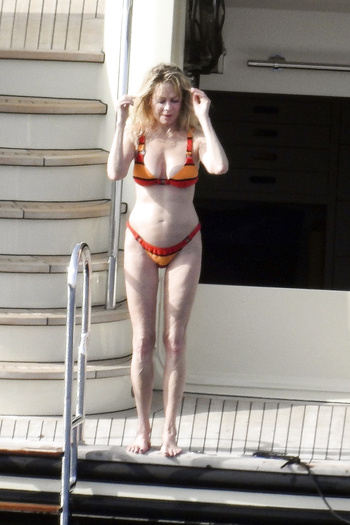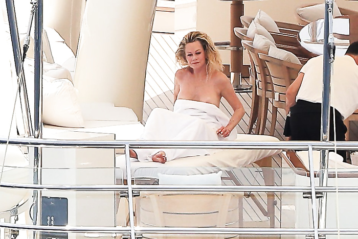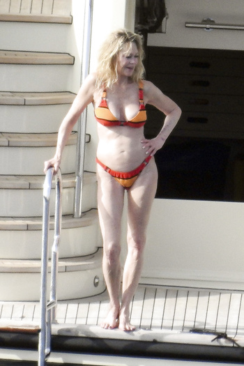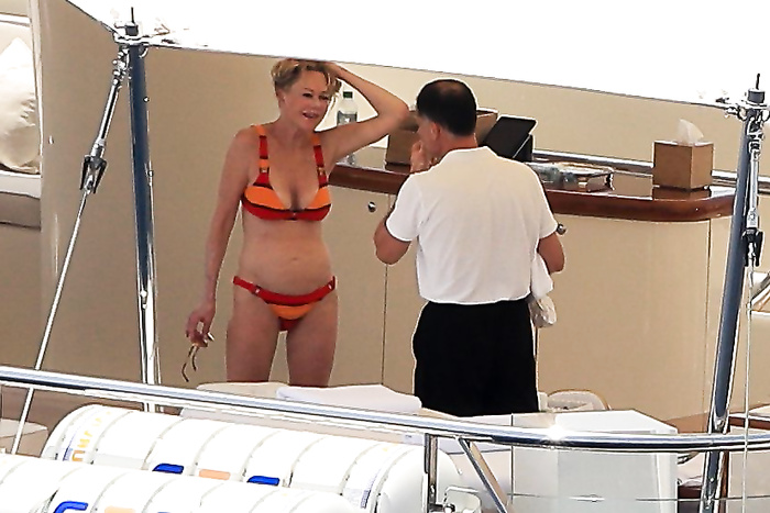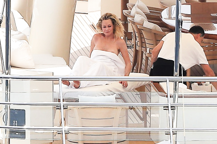 Actress Melanie Griffith (61 years!) is spotted on holiday on board of a luxury yacht with friends in Ibiza. At one moment she goes topless ready for her massage aboard the boat (5 July 2019).