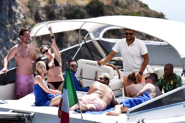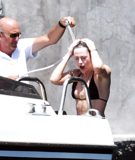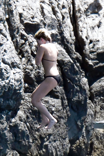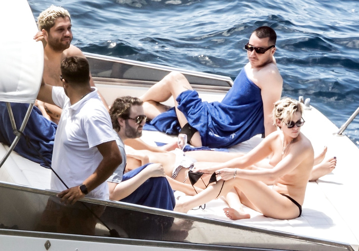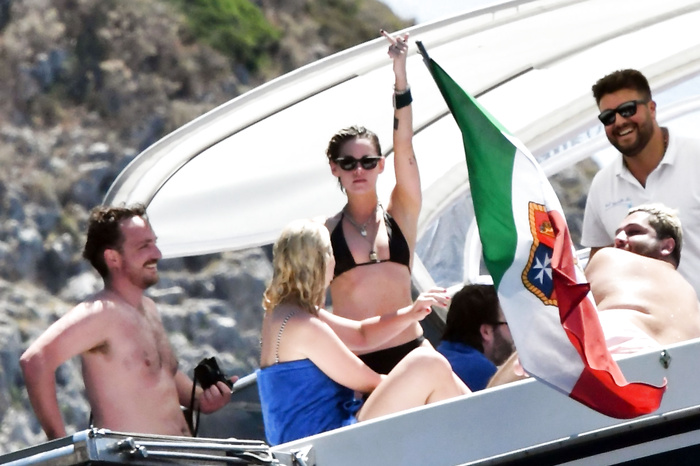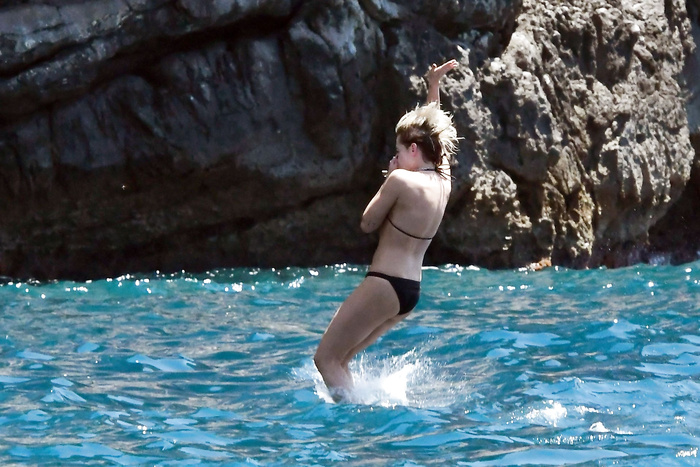 Actress Kristen Stewart (29 years) was caught topless on her summer holidays at the Amalfi Coast (Italy, 14 July 2019). She had fun diving off her boat and chilling with girlfriend Stella Maxwell and friends and went topless taking in the hot Italian sunshine.