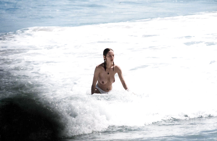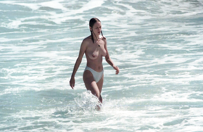 Uma Thurman (26 years) swimming topless on the beach in St. Bart's (July 1996).