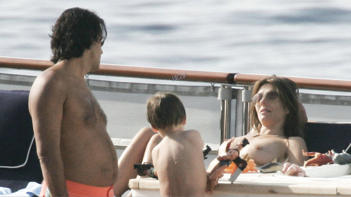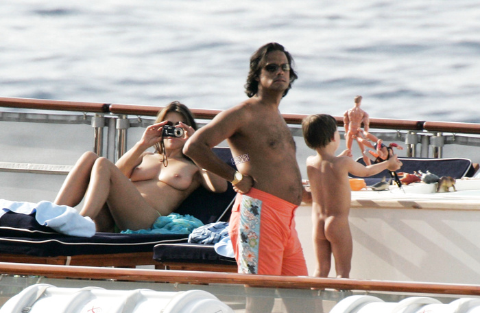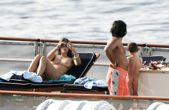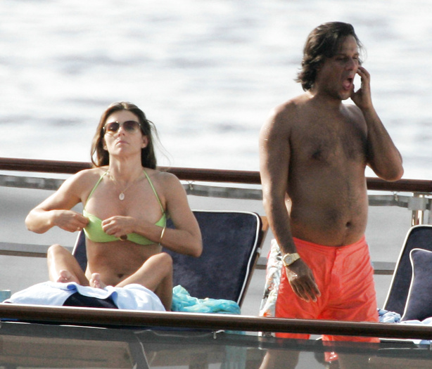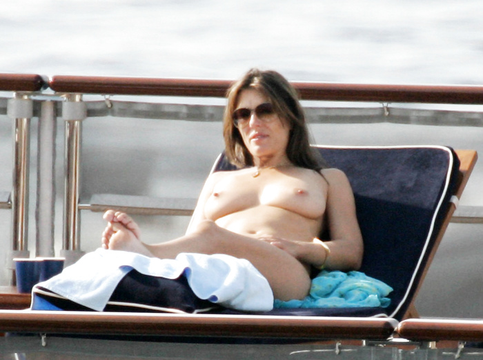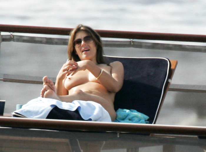 Elizabeth Hurley (she was 40 years old) sunbathing on a yacht in Capri, Italy (July 2005).
