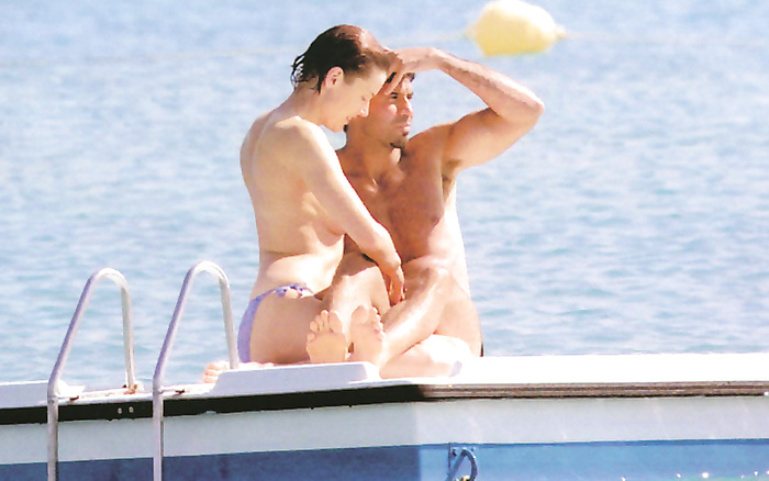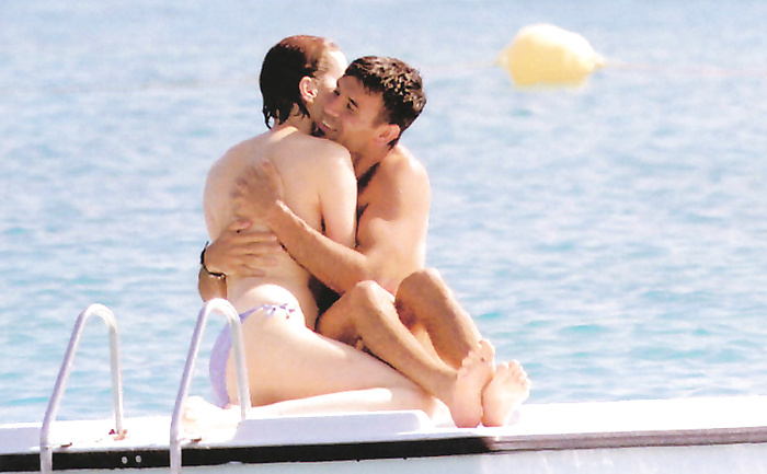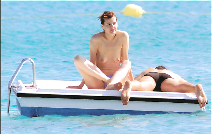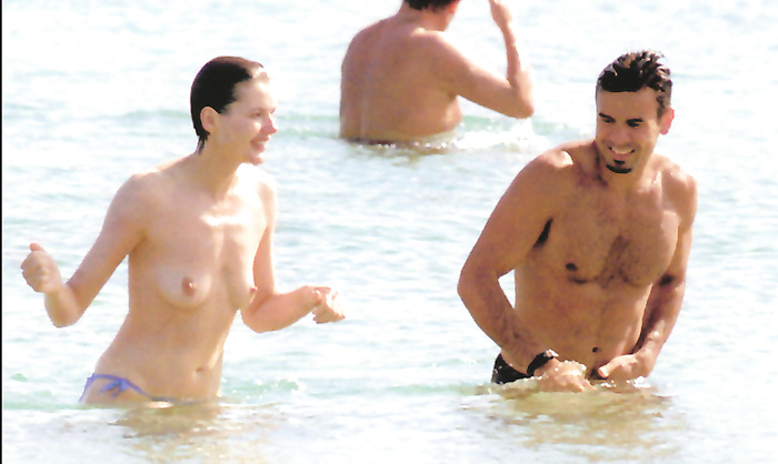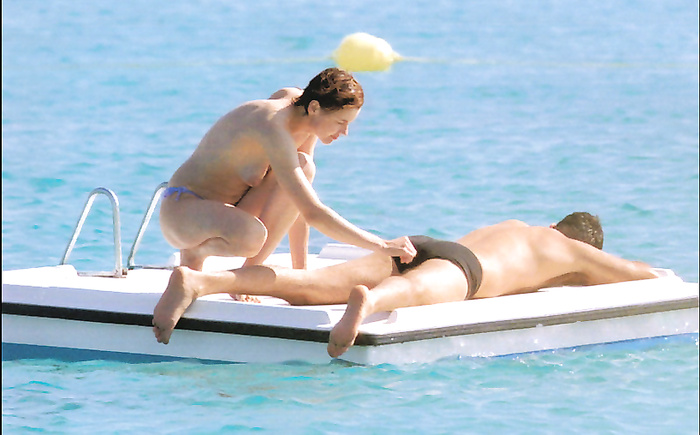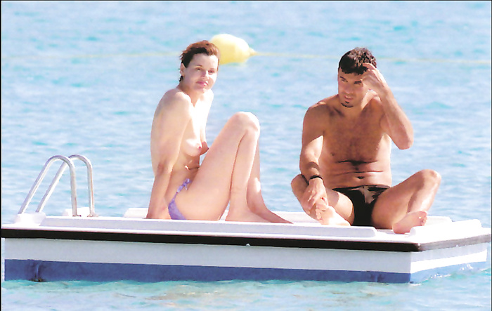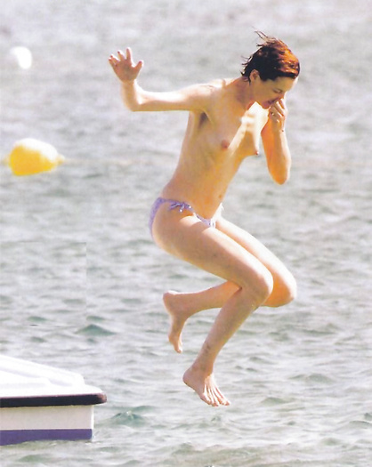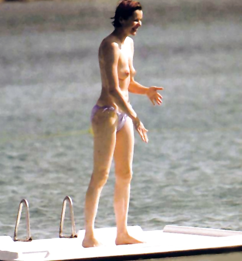 Geena David (she was 43 years old) swimming and sunbathing topless in 1999.