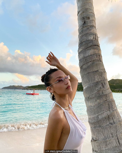 Watch Bella Hadid braless in see through top at the beach in St. Barts - December 08, 2019 in our scandal and leaked nude pics collection
